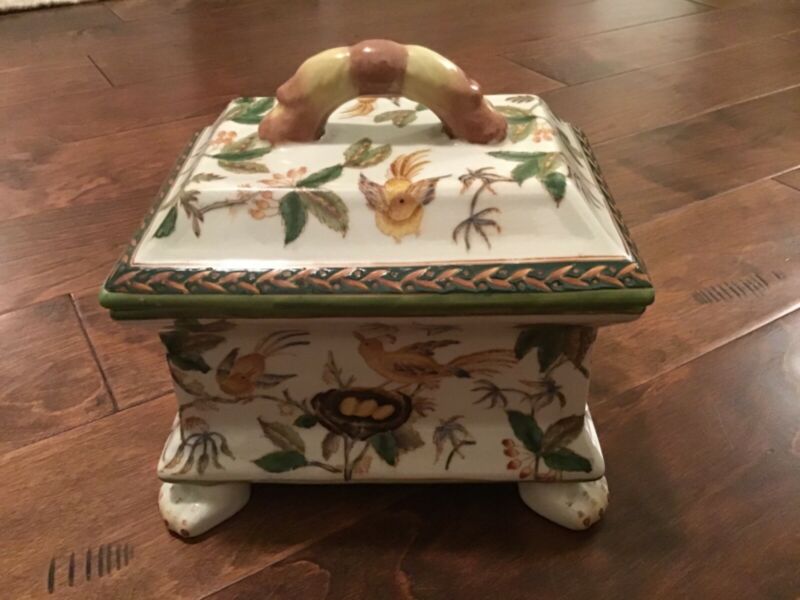 Vtg Asian Porcelain Lidded Footed Trinket Box 7" X 7" X 5"