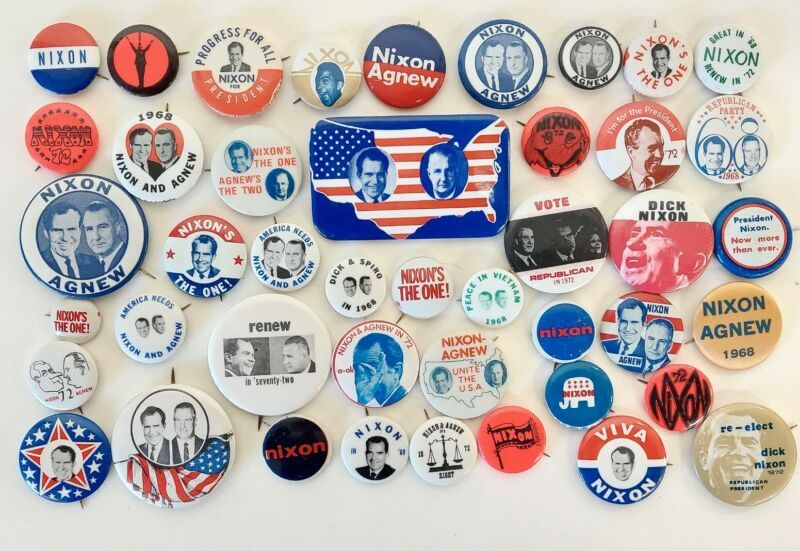 Title (ebay affiliate link): Lot of 44 Richard Nixon Presidential Campaign Pinback Buttons 1968 & 1972
