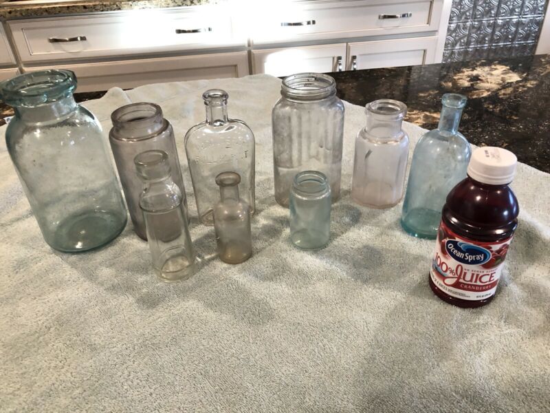 Title (ebay affiliate link): 9 VINTAGE Pharmacy/Apothecary Bottles Jars Medicine Glass Mixed Kind Size Lot 1