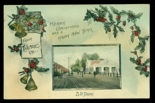1911 Tulare California postcard SP Depot Merry Christmas Happy New Year