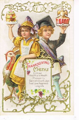 ANTIQUE EMBOSSED THANKSGIVING Postcard "MENU: HEALTH A LA WEALTH, PROSPERITY"