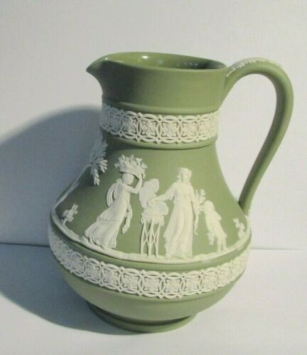 Title (ebay affiliate link): Vintage Sage Green White Wedgwood Jasperware Jug Pitcher Iconic Greek Figures 6"