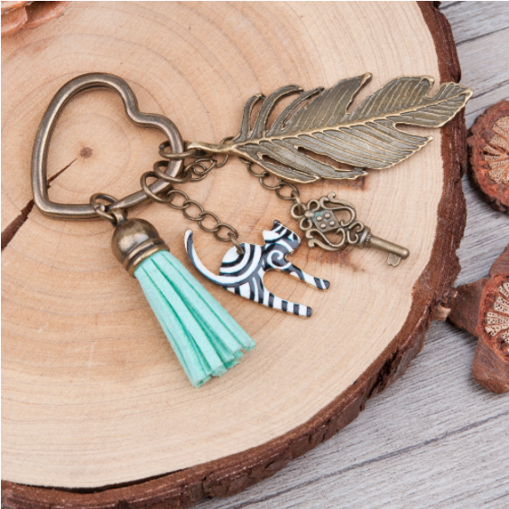 Title (ebay affiliate link): Antique Bronze Key Chains Key Vintage Feather Heart Pendant Cat Tassel Key Ring