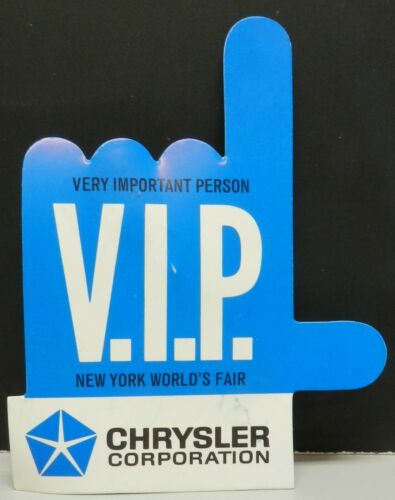 RARE WORLDS FAIR HAND NY V I P PIN PINBACK BUTTON CHRYSLER PLYMOUTH DEALER PROMO