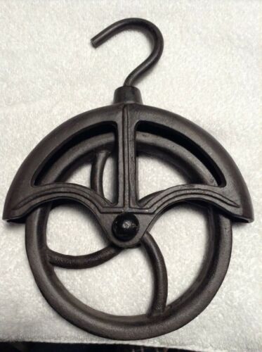 Title (ebay affiliate link): CAST IRON SPOKE WHEEL WELL BARN PULLEY with HOOK 11" tall works