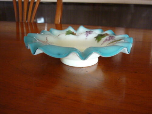 Late Victorian AUSTRIA opaline milk glass dish ripple edge grape & vine decor.