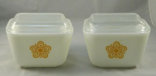 Pair of Pyrex Butterfly Gold 501 1.5 Cup Refrigerator Dishes w/Lids 1972-81