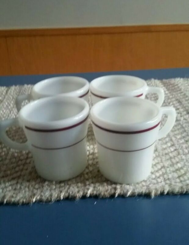 Title (ebay affiliate link): Vtg 4 Lot Pyrex White Milk Glass Mugs Corning Maroon Stripe Band D Handle USA
