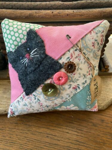 Primitive Stitchery Hand Stitched Cat and Old Buttons Vintage Quilt Ornie