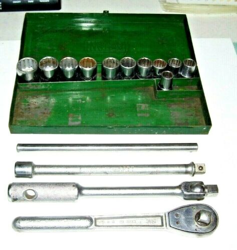 Vtg WALDEN WORCESTER Socket Set, Ratchet, Breaker, Extension, Box, 11 Sockets