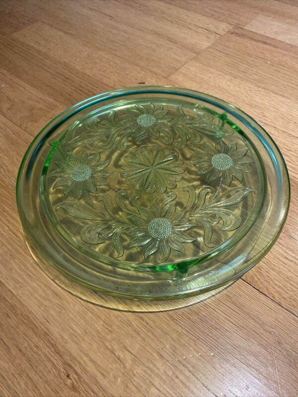 Title (ebay affiliate link): VINTAGE 10" GREEN DEPRESSION GLASS FLORAL HOT PLATE Coaster RAISED PLATTER