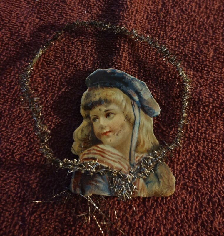 Title (ebay affiliate link): Victorian Paper & Tinsel Christmas Tree Ornament Little Girl in Blue