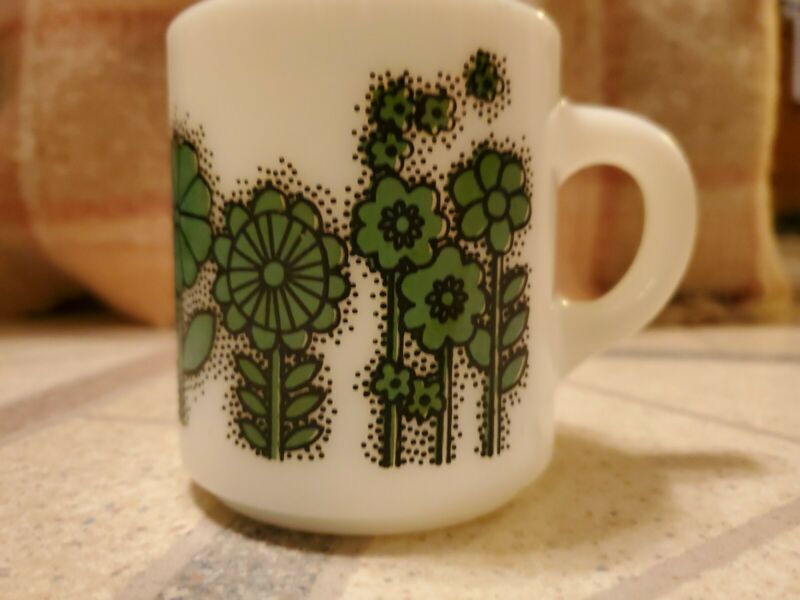 Vintage HAZEL ATLAS Green Flower Milk Glass Mug