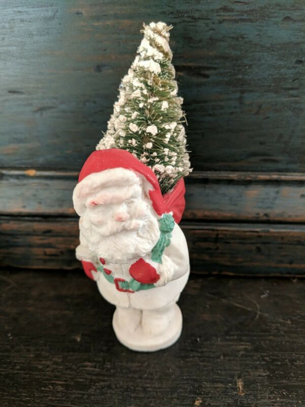 Title (ebay affiliate link): Antique/Vintage Bisque Christmas Santa Carrying Bottle Brush Tree 5"