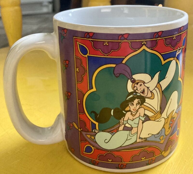 Title (ebay affiliate link): Disney Aladdin Mug Jasmine Genie Magic Carpet Vintage Cup A Whole New World 1993