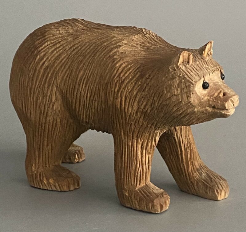 Hand Carved Folk Art Wooden Bear With Glass Eyes Carving