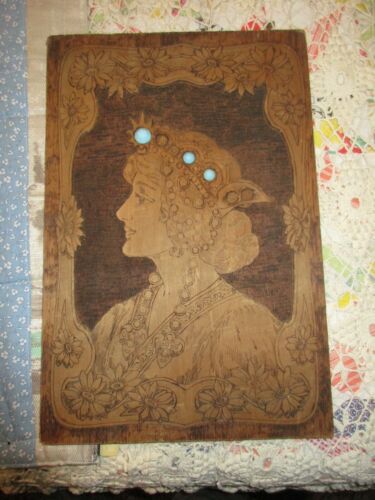 Title (ebay affiliate link): Antique Jeweled Medieval Crowned Queen Flemish Art Pyrography Plaque 867 10 x15"