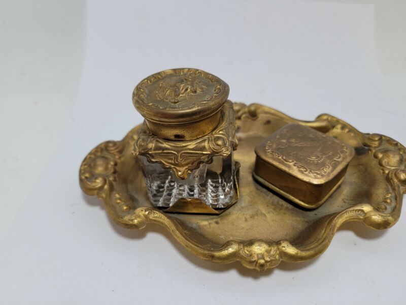 Title (ebay affiliate link): ANTIQUE INKWELL & STAMP HOLDER-ART NOUVEAU? VICTORIAN? CUPIDS-METAL-GOLD WASH-NR