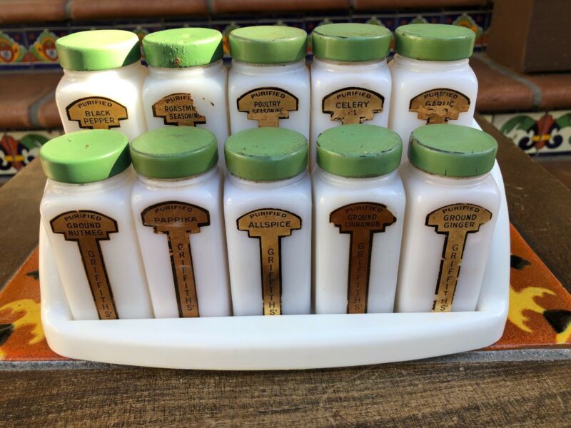 Title (ebay affiliate link): Vintage Griffith''s Set (10 White Milk Glass Spice Jars), GREEN lids, white Rack