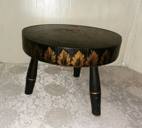 Vintage Milking Stool Footstool Pot Holder 3 Legged Wooden Black W/ Gold