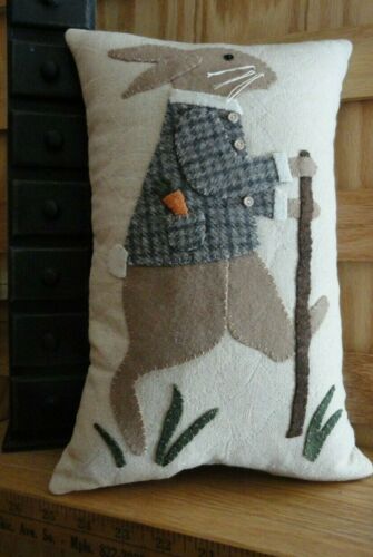 ~pRiMiTiVe Stitchery Wool Applique Pillow~Walking Rabbit~Easter~Spring Hare~