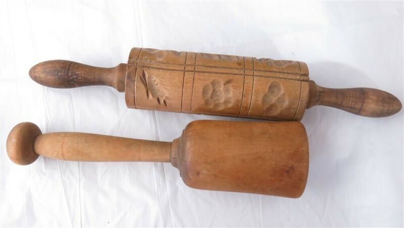 Primitive Springerle Wood Cookie Fish Rabbit Rolling Pin & Pestle Potato Smasher