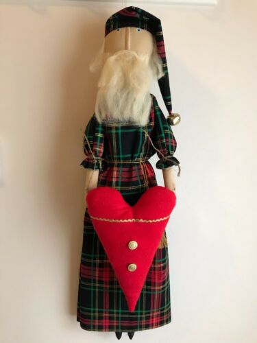 Title (ebay affiliate link): Primitive Valentine Santa Doll Red Flannel Heart Black Plaid Robe Gold Accents