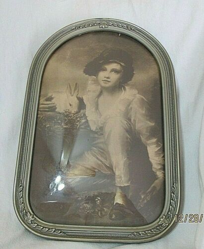 Antique Wooden Frame Oval at Top Square at Bottom Bubble Glass w Boy & Bunny Pic