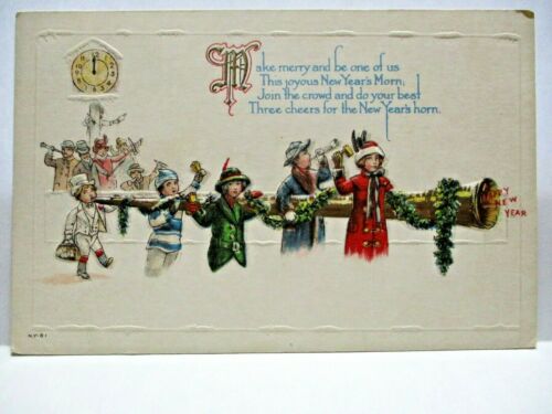 Title (ebay affiliate link): 1910 POSTCARD PEOPLE CARRYING LONG NEW YEAR''S HORN, MAKE MERRY