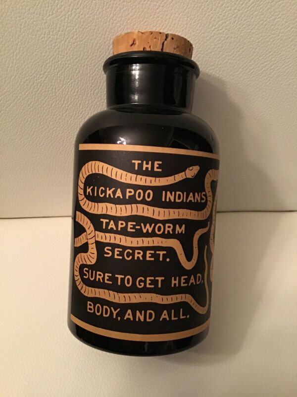 Title (ebay affiliate link): "THE KICKAPOO INDIANS TAPE-WORM SECRET" APOTHECARY BOTTLE. Authentic Repro.