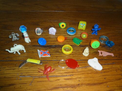 Title (ebay affiliate link): VINTAGE LOT OF CRACKER JACK GUMBALL MACHINE CHARMS PRIZES 60''s