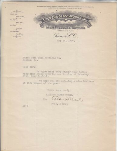 LAURENS GLASS WORKS INC. LETTERHEAD DATED MAY 14, 1926