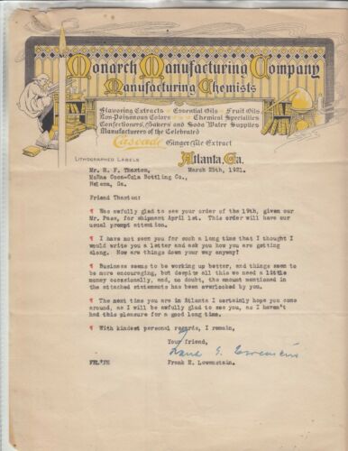 MONARCH MANUFACTURING CO. LETTERHEAD DATED MARCH 25th, 1921 SOLD SODA FLAVORS