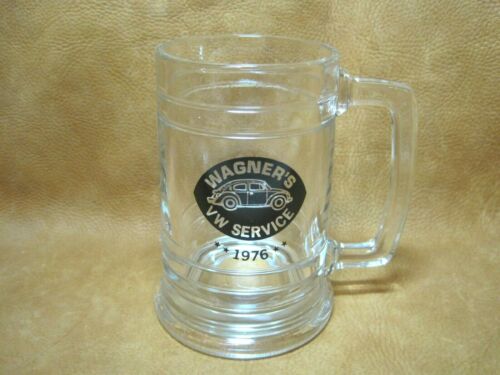 VINTAGE 1976 WAGNER''S VW SERVICE MUG - CLEAR GLASS - VOLKSWAGEN BEETLE BUG BUS