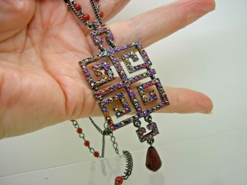 Vintage 1970''s Oxidised Silver Tone AB Garnet Crystal Greek Key Pendant & Chain
