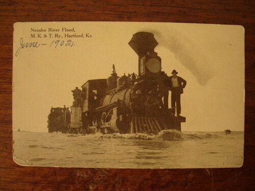 OLD PHOTO POSTCARD M K & T RAILWAY RAILROAD TRAIN NEOSHO RIVER FLOOD HARTFORD KS