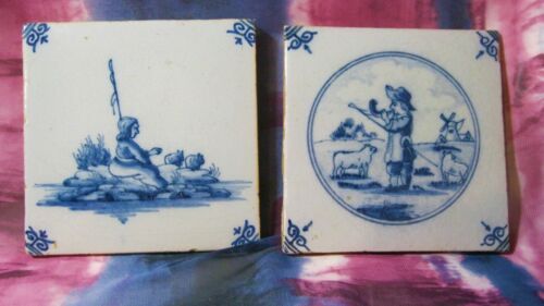 Pr Antique DELFT DUTCH Blue White TILES Shepherd & Shepherdess