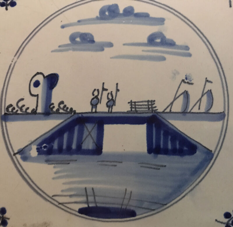 Antique Dutch Delft Blue tile, men on a bridge over canal.