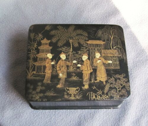 Title (ebay affiliate link): Victorian Black Lacquer Papier Mache Lidded Box Box Scene w/ People