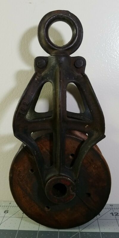Title (ebay affiliate link): Antique Cast Iron & Wood Pulley No. 122