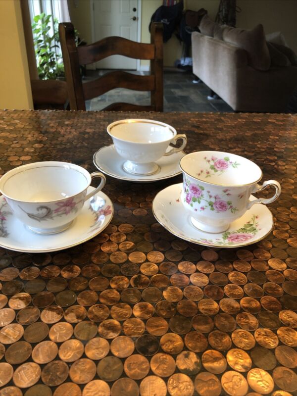 VINTAGE BONE CHINA Floral DESIGN TEA CUP SAUCER LOT OF 3