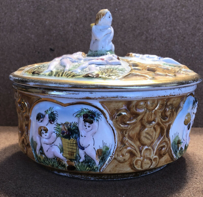Title (ebay affiliate link): CAPODIMONTE Italy Angels Putti Cherubs Lidded Bowl Candy Dish Reticulated
