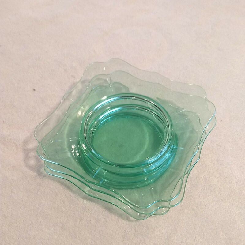 3 Vintage Depression green Glass 5" Square ripple edge Luncheon Plates