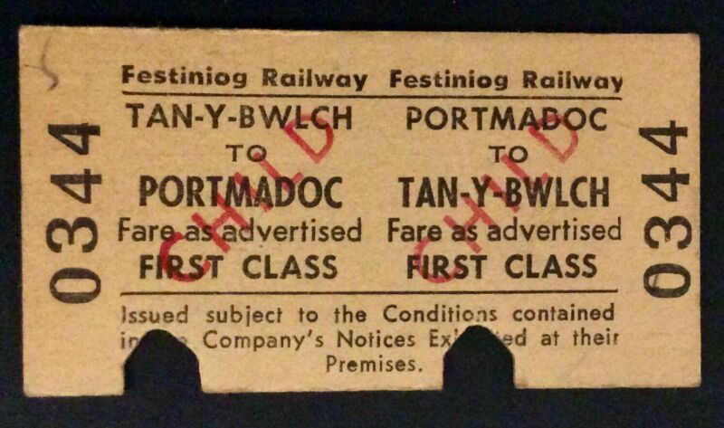 Title (ebay affiliate link): 1960s 1st Class Child Return Ticket Ffestiniog Railway PORTHMADOG - TAN Y BWLCH
