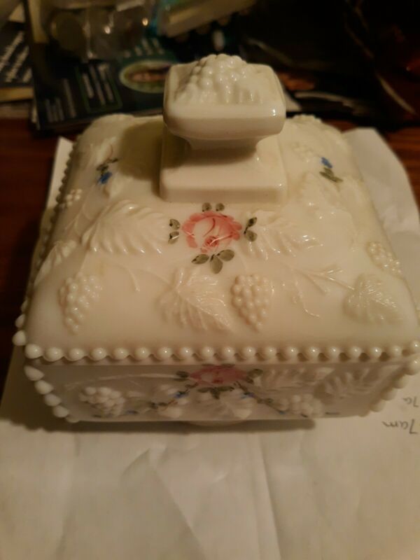 Title (ebay affiliate link): Westmoreland White Milk Glass Square Trinket Case With Grapes And Leaves Blue...