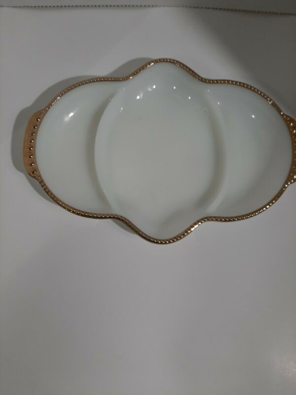 Title (ebay affiliate link): Vintage Fire King Milk Glass Dish Trimmed in Gold In Good Condition