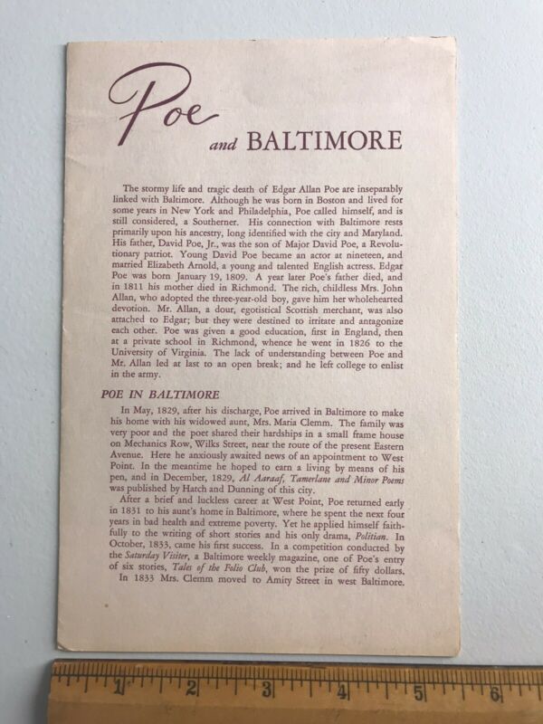 1964 Vintage Edgar Allan Poe Pamphlet Enoch Pratt Library Baltimore MD Old Photo