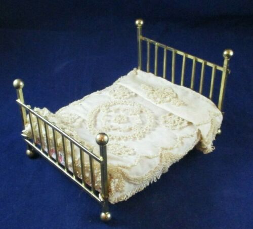 VINTAGE DOLL HOUSE FURNITURE BRASS KING SIZE BED w BEDDING 6.5" X 4.5" MINIATURE