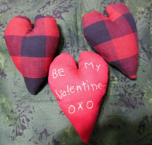 3 Primitive Handmade Red Buffalo Checked Heart Bowl Fillers, Ornies, Tucks