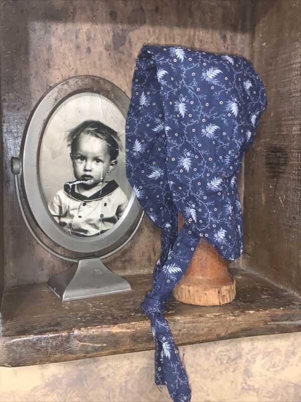 Old Spool & Sweet Primitive Doll Bonnet From Early Blue Calico